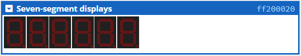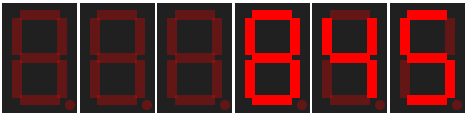 There are 6 output-only red seven segment displays, each of which can be used to display digits and a (limited) range of letters. Each segment of a display can be addressed individually to show these digits and letters.