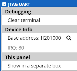 The JTAG (Joint Test Action Group) UART (Universal Asynchronous Receiver/Transmitter) simulates simple character-based input (keyboard) and output (console). Character input is handled by the 64 byte Read FIFO queue, and character output by the 64 byte Write FIFO queue. (In the actual hardware the sizes of the Read and Write FIFOs are adjustable.) Text is entered into and displayed in the Terminal area. The UART displays only standard ASCII characters.