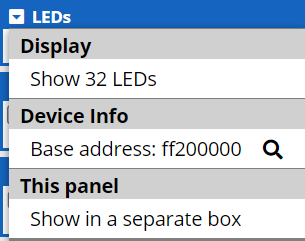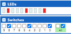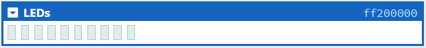 There are 10 output-only red LEDs which are set by writing to bits 0 - 9 of the LED memory. Bits 10 - 31 are unused. A 1 turns the LED on, a 0 off.