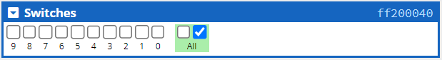 There are 10 input-only switches which are read from bits 0 - 9 of the switch memory. A switch bit is set to 1 if the switch is pressed, 0 otherwise. Bits 10 - 31 are unused.