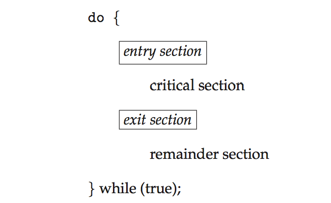 - Each process must ask permission to enter critical section in entry section , may follow critical section with exit section , then remainder section